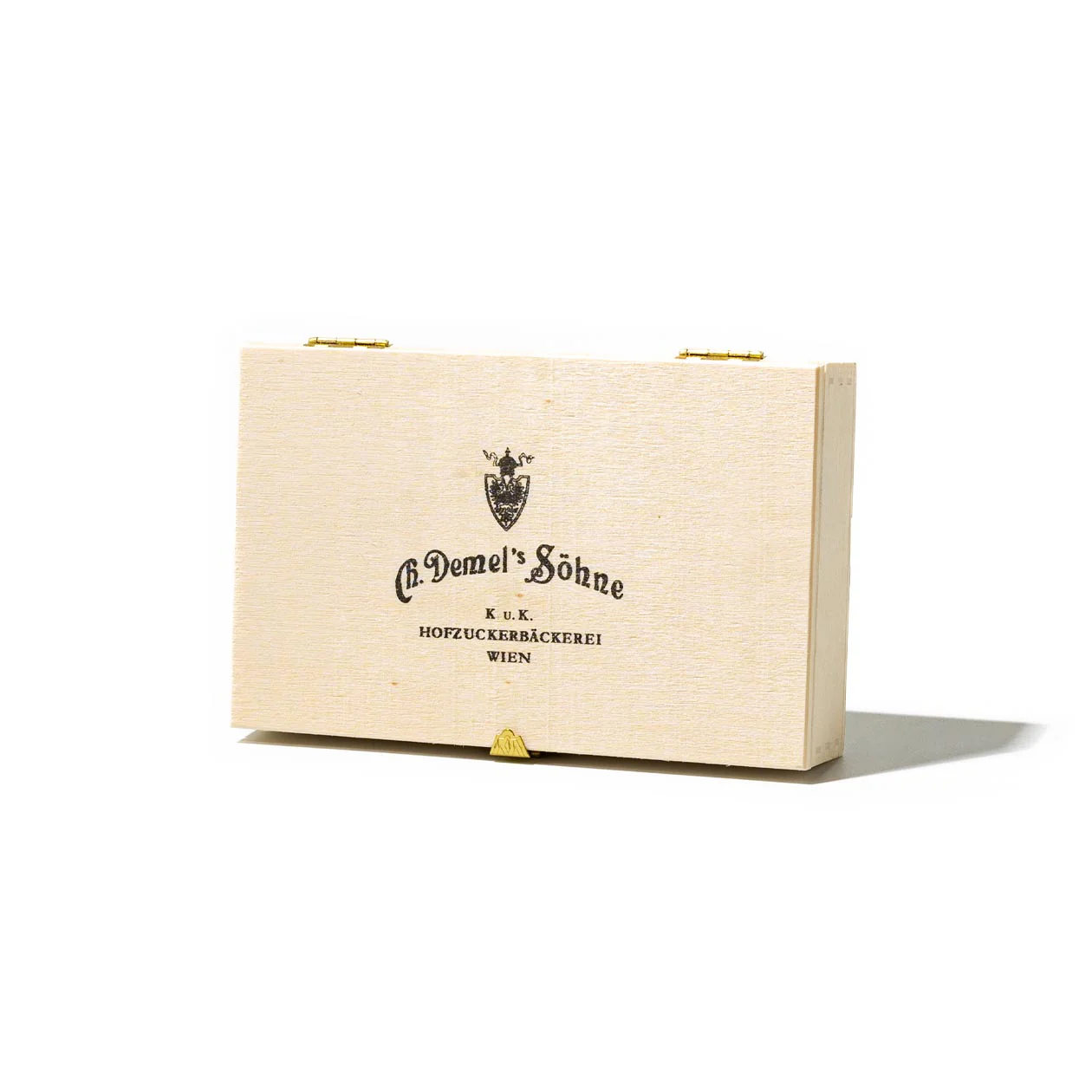 Zwei Lagen vom beliebtesten Demel Konfekt in einem Holzkisterl. Mit Spuren von Alkohol. Enthalten sind: 3 Figaro, 2 Creme Nougat, 2 Nougatwaffel Quadrat, 2 Nougatwaffel Raute, 2 Rosinenmarzipan, 3 Runde „D“, und 6 Krokantplatterl.