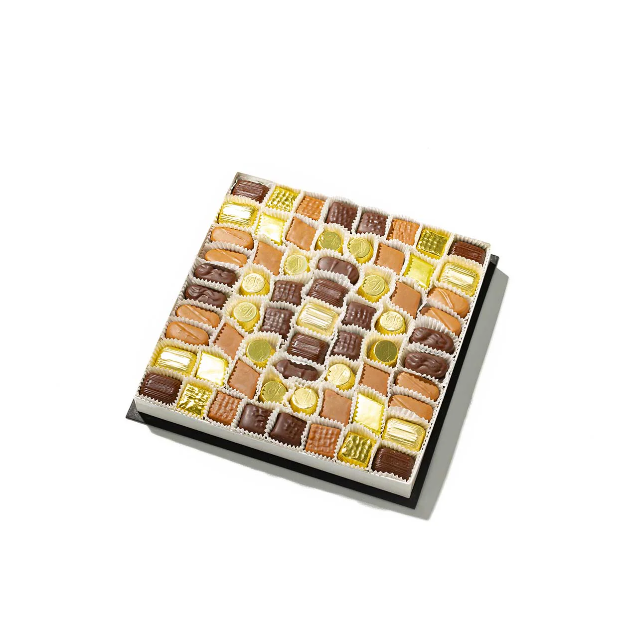 Obere Lage: 11 Walnussplatterl, 8 Brioni, 6 Pistazienmarzipan, 8 Nougatwaffel Quadrat, 8 Rosinenmarzipan, 12 Nougatwaffel Raute, 12 Runde „D“