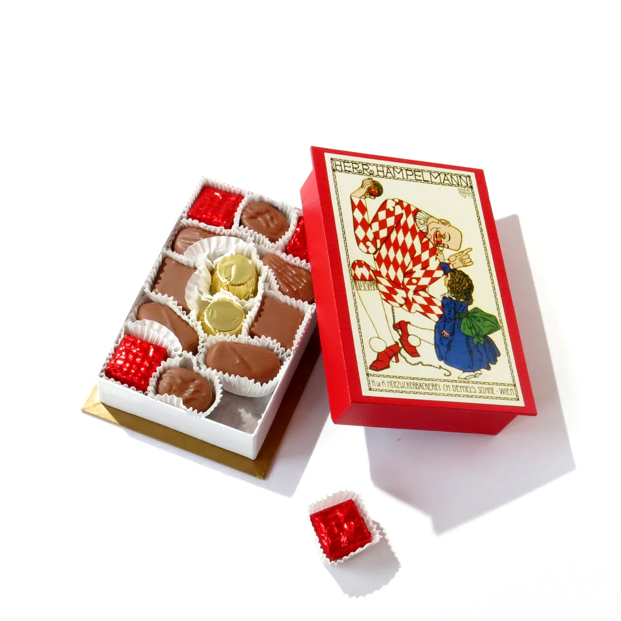 Lustig, verspielte Bonbonniereschachtel entworfen von den ,,Wiener Werkstätten'' gefüllt mit einer feinen Mischung aus Milchschokoladenkonfekt mit Nougat-, Kaffee- und Orangengeschmack.