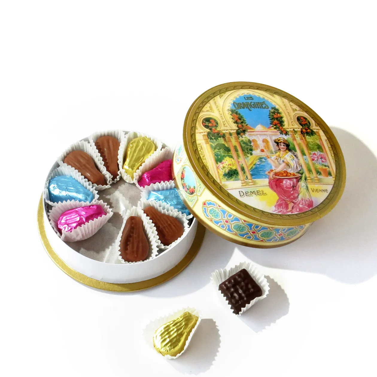 Stilvolle Rundbonbonniere mit malerischem Motiv, gefüllt mit Orangenmarzipankonfekt und Orangenfondantkonfekt